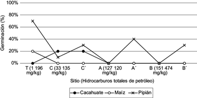 Los puntos ubicados a 30 cm del flujo del hidrocarburo con menor contaminación (A’, B’ y C’), mostraron mayor frecuencia de germinación (p < 0.001) (Fig. 7). A la distancia de 30 cm fuera del flujo del derrame, el terreno presenta menor contaminación. El porcentaje de germinación de maíz y de cacahuate fue del 20 % en todos los casos, observándose germinación. Por su parte, el pipián alcanzó hasta 70 % de germinación y tuvo una mayor frecuencia de germinación (p < 0.001) en el suelo de menor contaminación.