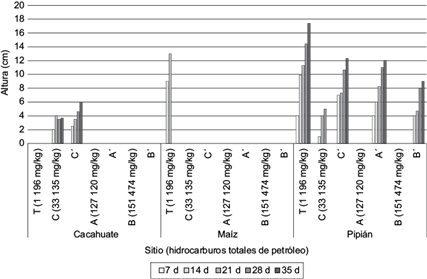 Fig. 8 Crecimiento (cm) de los cultivos de cacahuate, maíz y pipián a los 7, 14, 21, 28 y 35 días posteriores a la germinación, en el sitio contaminado con hidrocarburos en los distintos puntos muestreados. T: suelo testigo; A: suelo contaminado en el punto A; B: suelo contaminado en el punto B, y C: suelo contaminado en el punto C. Los sitios marcados con comilla (e.g., A’) indican siembra realizada en una línea a 30 cm del punto original.