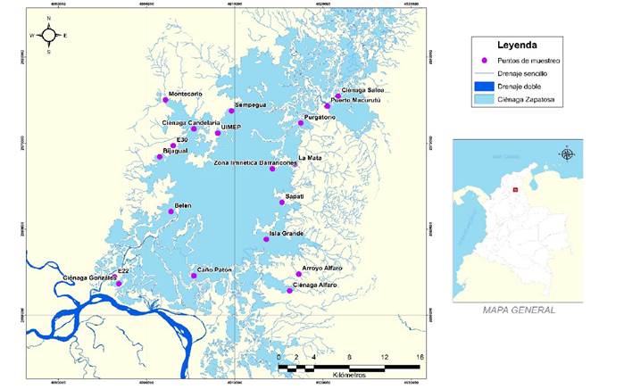 Área de estudio. La ciénaga de Zapatosa es una depresión cóncava con una profundidad máxima de 12 metros (Fig. 1). Por su ubicación geográfica, es el mayor reservorio de agua dulce de Colombia y la trampa de sedimentos más grande de la planicie inundable de los ríos Cesar y Magdalena. Estacionalmente, es una zona de amortiguamiento del río Magdalena (Rangel-Ch., 2012), pero su origen principal es el río Cesar, el cual nace en las estribaciones de la Sierra Nevada de Santa Marta. La ciénaga de Zapatosa es responsable de buena parte de la dinámica hídrica del sistema geográfico del nororiente colombiano. En época de caudales altos, el río Magdalena irrumpe en la ciénaga y hace retroceder al río Cesar, arrastrando juveniles de especies acuáticas importantes para la repoblación natural del CCZ; en la época seca, la ciénaga se contrae porque el río Magdalena recibe el agua almacenada en la planicie de inundación por medio de canales y zonas de menor consolidación de sedimentos. El patrón climático en el CCZ es bimodal-tetraestacional, con un ciclo mayor de lluvias que se inicia en septiembre y que conduce a una fase de caudales altos en el período octubre-diciembre; el otro periodo de niveles altos de precipitación ocurre en mayo-julio, pero es notablemente menor (Rangel-Ch., 2012).