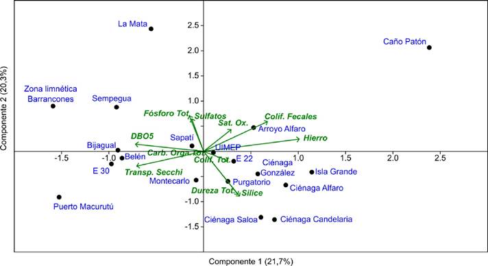 El test de esfericidad de Barlett (p = 0,05) indicó que el análisis proporcionó una reducción eficiente de la dimensionalidad de los datos, pero la medida de Kaiser-Meyer-Olkin fue 0,36 (< 0,5), lo que implica que la adecuación del muestreo fue “inaceptable”, es decir que la proporción de varianza en las variables podría ser causada por otros factores subyacentes. En consecuencia, los resultados del PCA deben asumirse con precaución. El hierro (en el componente 1) y el sílice (en el componente 2) fueron las variables más asociadas a los ejes del ordenamiento. Según este análisis, parecen existir cuatro grupos de estaciones. Un primer grupo estuvo constituido por el Caño Patón y el Arroyo Alfaro, los cuales presentaron una alta concentración de coliformes termotolerantes y de hierro. Los dos sitios de este primer grupo hicieron parte de los lugares con mayor grado de contaminación. Un segundo grupo lo conformaron las estaciones UIMEP, Purgatorio, E22, Ciénaga Alfaro, Ciénaga González, Ciénaga Candelaria, Ciénaga Saloa e Isla Grande, todas ellas con mayor dureza total, más sílice y una concentración media a alta de coliformes totales. Este conjunto de estaciones parece tener un mayor grado de mineralización del agua. Un tercer grupo asoció a los sitios La Mata, Zona limnética Barrancones y Sempegua, los cuales tendieron a una alta concentración de sulfato y a una mayor DBO5. El cuarto grupo correspondió a los lugares Montecarlo, Sapatí, Puerto Macurutú, Belén, Bijagual y E30, que se ubicaron opuestos a las mayores cantidades de hierro y coliformes fecales, con aguas más transparentes. Este cuarto grupo parece ser el de condiciones de menor contaminación del agua, aunque presentan cierta cantidad de carbono orgánico.