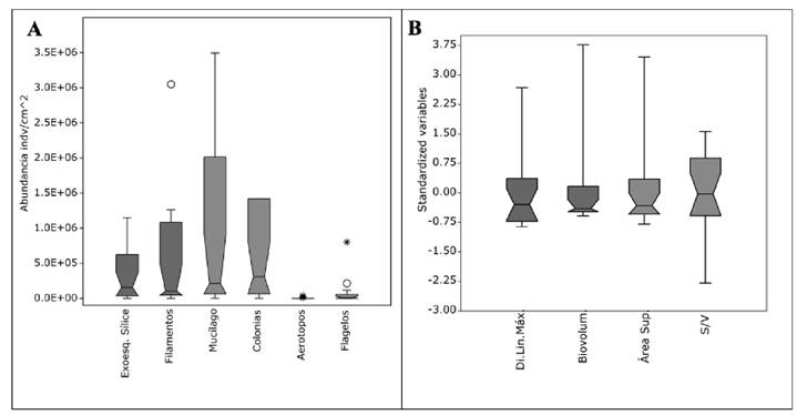 Figura 3 Análisis de cajas y bigotes (“box plots”) de los rasgos morfofuncionales de comunidad de ficoperifiton del CCZ. A. Atributos cualitativos; datos de abundancia de los organismos que presentan los rasgos (ind/cm2). B. Caracteres morfológicos estandarizados.