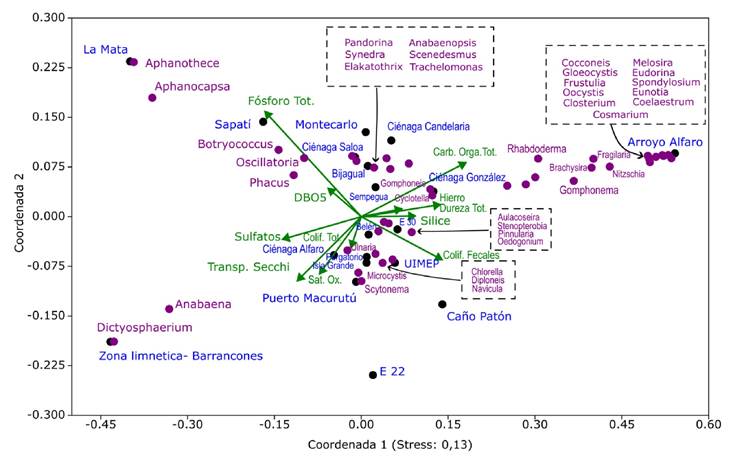 Relaciones entre las abundancias de ficoperifiton y las variables ambientales. Para este análisis se tuvieron en cuenta las 11 variables ambientales evaluadas en el PCA y la composición y abundancia de los géneros de las algas perifíticas (Tabla 2S). El resultado del NMDS se muestra en la Figura 4, en la que se observa que algunos sitios se ubicaron alejados del origen de los datos. Así, a la Zona limnética-Barrancones, con mayor transparencia y aguas más saturadas de oxígeno, se asociaron los géneros Anabaena y Dictyosphaerium (Nägeli, 1849); en La Mata, donde el fósforo total fue alto, se destacaron Aphanocapsa (Nägeli, 1849) y Aphanothece (Nägeli, 1849); y en el Arroyo Alfaro, con predominancia de carbono orgánico total y tendencia a aguas más duras, se presentó un grupo de algas que incluyó los géneros Cocconeis (Ehrenberg, 1836), Gloeocystis (Nägeli, 1849), Oocystis (Nägeli ex A.Braun, 1855), Closterium (Nitzsch ex Ralfs, 1848), Melosira, Eudorina (Ehrenberg, 1832), Spondylosium (Brébisson ex Kützing, 1849), Eunotia, Coelastrum (Nägeli, 1849), Cosmarium y Frustulia (C.Agardh, 1821), entre otros. Otros taxones, como Phacus (Dujardin, 1841), Rhabdoderma, Gomphonema (Ehrenberg, 1832), Oscillatoria y Botryococcus (Kützing, 1849) no mostraron una asociación clara a algún sitio de muestreo específico. El “stress” de este ordenamiento fue de 0,13 (inferior a al valor límite de 0,2) y se considera como un resultado que permite hacer deducciones valederas (Clarke, 1993). Desde el punto de vista de la composición y abundancia de las algas perifíticas, se nota una dispersión de los datos y no se destacan otros patrones de agrupamiento o segregación, más allá de los casos mencionados.