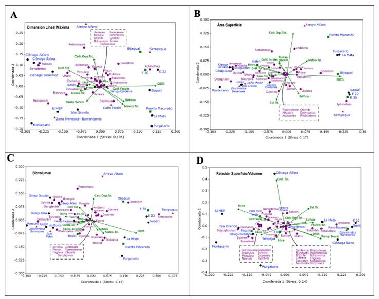 Para la dimensión lineal máxima (Fig. 5A), los factores determinantes en la coordenada 2 fueron el carbono orgánico total y las coliformes totales; para el área superficial (Fig. 5B), además del carbono orgánico total, otras variables importantes fueron la saturación de oxígeno y sulfato; en el caso del biovolumen (Fig. 5C), el carbono orgánico tuvo la mayor influencia sobre esta coordenada 2; por su parte, las coliformes totales mostraron un mayor dominio en el eje Y de la relación S/V (Fig. 5D). De otro lado, los cuatro ordenamientos tuvieron un “stress” < 0,2, o, dicho de otra manera, los modelos estadísticos obtenidos fueron aceptables. Se destacó el ordenamiento de la dimensión lineal máxima (Fig. 5A), que alcanzó el menor “stress” (0,105), lo cual indica que en este caso el ajuste del modelo con la realidad fue el más preciso. Para el área superficial, el biovolumen y la relación S/V el “stress” fue de 0,17, 0,15 y 0,14, respectivamente, lo cual señala que los datos permitieron establecer algunas diferencias en el espacio de dos dimensiones del ordenamiento, por lo que se pueden considerar como modelos moderadamente aceptables (Kruskal, 1964; Clarke, 1993). Con base en lo anterior, se detallan a continuación los resultados del ordenamiento más ajustado, correspondiente a la dimensión lineal máxima.
