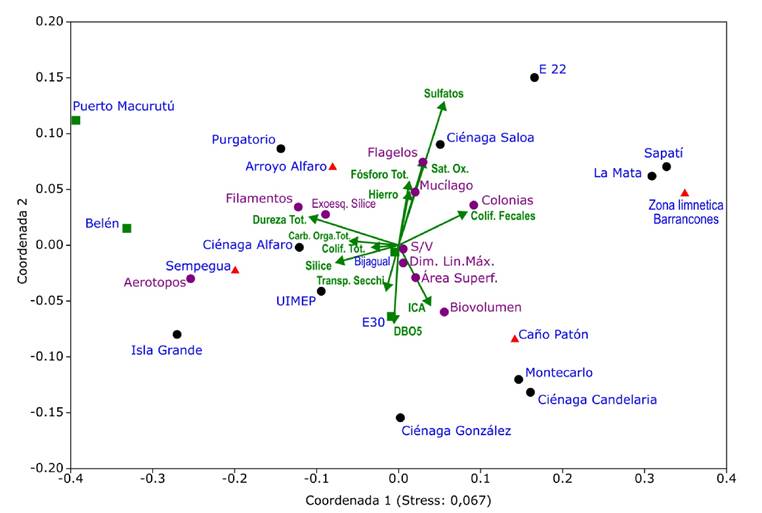 En un intento por estudiar de manera simultánea el efecto del ambiente fisicoquímico y bacteriológico sobre las variables cualitativas y morfológicas del ficoperifiton del CCZ, se realizó el NMDS que se muestra en la Figura 6. Este análisis incluyó las abundancias de las características funcionales cualitativas (formas de vida) y los promedios de los rasgos dimensionales y los relacionó con los factores fisicoquímicos, bacteriológicos y de calidad del agua-ICA. Las variables más relacionadas con la coordenada 1 fueron las coliformes fecales y la dureza total; con la coordenada 2 se asociaron principalmente el sulfato, la saturación de oxígeno y la demanda biológica de oxígeno. Como se observa en este ordenamiento, los atributos de formación de filamentos y de presencia de exoesqueleto de sílice estuvieron muy asociados a la dureza total, en especial en los sitios Arroyo Alfaro y Ciénaga Alfaro. La presencia de flagelos se relacionó con el sulfato y la saturación de oxígeno en la Ciénaga Saloa. Los aerotopos se asociaron con el sitio Sempegua, pero sin un factor ambiental determinante. El biovolumen se vinculó con el ICA y tendió a ubicarse en dirección al Caño Patón, Montecarlo y la Ciénaga Candelaria. La presencia de mucílago se asoció al hierro y al fósforo total, sin ubicarse espacialmente en ningún lugar. Por su parte, la capacidad de formar colonias se asoció a mayores cantidades de bacterias coliformes fecales, y este vector mostró tendencia dirigirse hacia Sapatí, La Mata y la Zona limnética-Barrancones. Los demás rasgos morfofuncionales (dimensión lineal máxima, área superficial y relación S/V) no exhibieron patrones concluyentes de asociación con los factores ambientales ni con sitios específicos dentro del CCZ. En general, se puede decir que las estaciones con mejores condiciones de calidad fisicoquímica del agua (marcadas con cuadrados verdes en la Fig. 6), se ubicaron hacia la región izquierda del ordenamiento, mientras que aquellos sitios de menor calidad (triángulos rojos) se ubicaron de manera dispersa en el ordenamiento. Se destaca en este análisis NMDS el “stress” bajo (0,067), que indica un muy buen ajuste de los datos con el modelo estadístico obtenido.