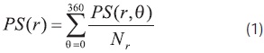 The power spectrum of an image was represented in polar coordinates as PS(r,θ), where ris the discrete frequency, θ is the angle of orientation on the image, and Nr is the number of data points available for each frequency r. The average power spectrum over all orientations was calculated from