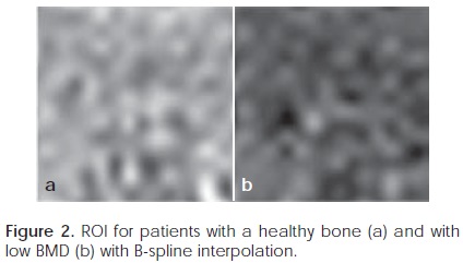 BMDs were obtained for all subjects by the mean value of the three lumbar vertebras. The Region of Interest (ROI) was detected automatically in the trabecular bone by the commercial software. In texture analysis, ROIs were identified manually in thesameapproximate region employed in BMD measurement.