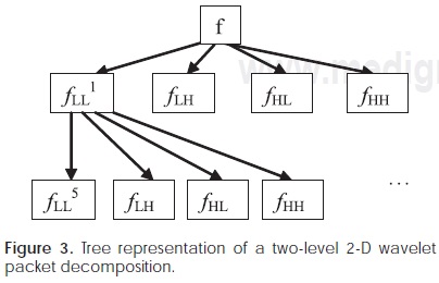 The 2D wavelet transform can be performed by the tensor product of two 1-D base functions along the horizontal and vertical directions, and the corresponding filters can be expressed as hLL(k,l) = h(k)h(l), hLH(k,l) = h(k)g(l), hHL(k,l) = g(k)h(l), and hHH(k,l) = g(k)g(l). An image (0 can be decomposed into four sub-images by convolving the image with these filters. These four sub-images characterize the frequency information of the image in the LL, LH, HL, and HH frequency regions, respectively. The WPT repeats this process for each sub-image (Figure 3). The LH, HL and HH represent high spatial frequency components related to horizontal, vertical and diagonal image details, respectively (Figure 4).
