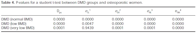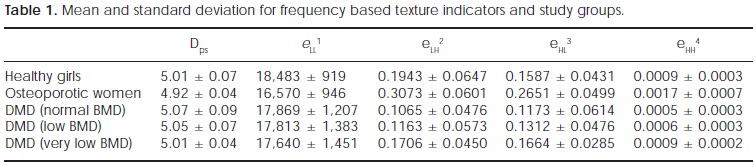 When comparing the healthy girls group with osteoporotic women either by Dps or the four WPT energy bands (Table 2), significant differences were found (p < 0.0004). This test demonstrates the great difference in spatial frequency components between healthy and osteoporotic subjects. For this case, Dps decreases with osteoporosis (as previously reported), but on the contrary, energy in eLH2, eHL3, eHH4 increases as high spatial frequencies appear.
