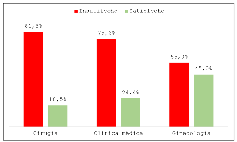 La frecuencia de insatisfacción (62.8 %) detectada en esta muestra es mayor a la detectada en otro hospital general donde en 2018, con el mismo instrumento, se halló insatisfacción en 59 % de los pacientes egresados de clínica médica, en 60 % de las salas de ginecoobstetricia y en 59 % de los servicios de cirugía general.20-22