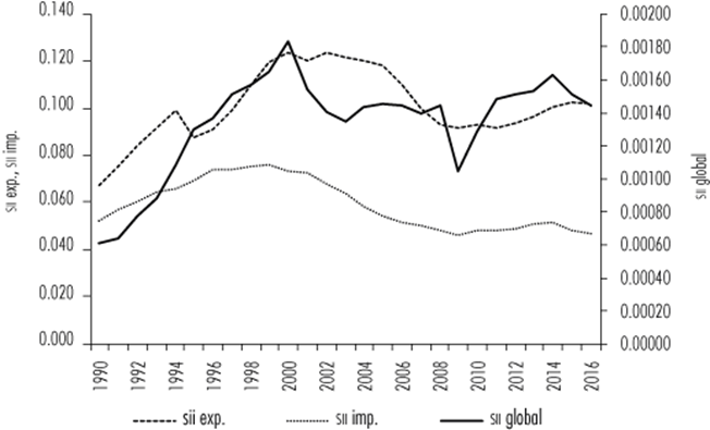 NAFTA’s SII values were significantly higher than those of MERCOSUR. These findings can be explained to a large extent by changes in the origin and destination of trade, as well as each countries’ respective structure and trade specialization profile.