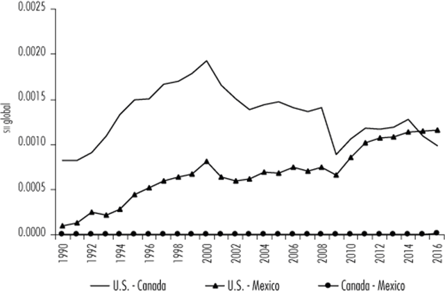A significant difference can also be seen between integration trends, given that MERCOSUR made little progress throughout the study period, while within NAFTA there was a significant growth. Likewise, MERCOSUR’s global index conformed to the Brazil-Argentina index, while NAFTA’s global index conformed to the U.S.-Canada index (see Figure 12). In the case of MERCOSUR, no other bilateral integration came close to the trajectory of the large partners (see Figure 10), while in NAFTA the U.S.-Mexico index was similar to that of the bloc (see Figure 12). Therefore, we can conclude that large partners dominated these integrations.