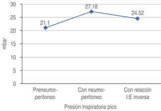 En la Figura 2 se puede observar el comportamiento de la presión inspiratoria pico antes del neumoperitoneo, después del neumoperitoneo y luego de la inversión del índice inspiración-espiración, observándose un aumento de la presión pico luego del neumoperitoneo y una disminución significativa luego de la inversión del índice.