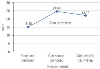 En relación a la presión meseta, vemos un comportamiento similar al de la presión inspiratoria pico, observándose un aumento de la presión meseta luego del neumoperitoneo y una disminución de la misma luego de la inversión del índice inspiración-espiración (Figura 1).
