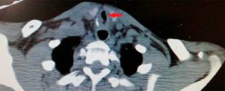 Figura 2: Tomografía simple de cuello en corte axial. Ventana para tejidos blandos. Se muestra disminución del calibre de la vía aérea de 5.1 mm (línea roja señala la luz de la tráquea).