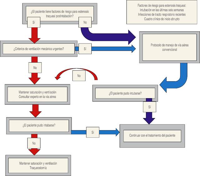 2. El adecuado tratamiento de la ETPI requiere de un enfoque multidisciplinario. El médico de primer contacto debe realizar una historia clínica breve y dirigida en antecedentes patológicos para la sospecha diagnóstica inicial, y en su abordaje, contar con los elementos necesarios para resolver cualquier posible eventualidad, incluyendo la disponibilidad de dispositivos que permitan ventilar al paciente en caso de que no se pueda realizar intubación exitosa. La mascarilla laríngea es una herramienta de fácil acceso para garantizar esto. Por otra parte, la experiencia en el uso de dispositivos avanzados de vía aérea es necesaria. La laringoscopía convencional y la videolaringoscopía no permiten el diagnóstico; consultar un experto de vía aérea es importante. El uso de videoestilete tiene una curva de aprendizaje elevada, pero es portátil y puede llevarse hasta la cama del paciente lo que permite diagnóstico certero, además provee información acerca del sitio de la estenosis y la estrechez de la misma. Es posible que se requiera traqueostomía de emergencia; el involucro del servicio de otorrinolaringología es importante. En caso de no contar con todos los elementos o personal requeridos, debe buscarse apoyo en otra unidad, lo que puede realizarse (como en nuestro caso) siempre y cuando se mantenga la oximetría del paciente estable.