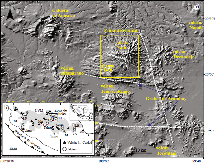 Gómez-Tuena et al., (2005) sintetizan la evolución geológica del CVTM en cuatro episodios principales: (1) el establecimiento de un arco de composición intermedia en el Mioceno medio y tardío, (2) un episodio máfico del Mioceno tardío, (3) un episodio silícico de finales de Mioceno, que llega a ser bimodal en el Plioceno temprano y (4) la formación de un arco moderno con gran variabilidad composicional a partir del Plioceno tardío. Debido a sus características estructurales Demant (1978) y Pasquaré et al. (1988) dividieron al CVTM en tres sectores, 1. Occidental, 2. Central y 3. Oriental. En el sector central se localiza el graben de Acambay, una estructura orientada E-O y asociada a extensión intra-arco, la cual se ha identificado como sísmicamente activa (Suter et al., 1995; Quintero-Legorreta, 2002; Sunyé-Puchol et al., 2015). Al norte del graben de Acambay se sitúa un grupo de estratovolcanes de más de 3000 m s.n.m. Entre los que destacan el Altamirano, Temascalcingo, Nopala, Decandeje y Ñadó (Figura 1). En la parte oeste se encuentra la Caldera de Amealco, la cual ha sido investigada en detalle por Aguirre-Díaz y Mc Dowell (2000). La estratigrafía de esta zona fue estudiada a escala regional por Silva-Mora, (1997), con el reconocimiento de varios eventos volcánicos documentados desde el Eoceno hasta el Pleistoceno, y en los cuales se identificaron varias estructuras volcánicas, así como la caracterización de sus productos emitidos.