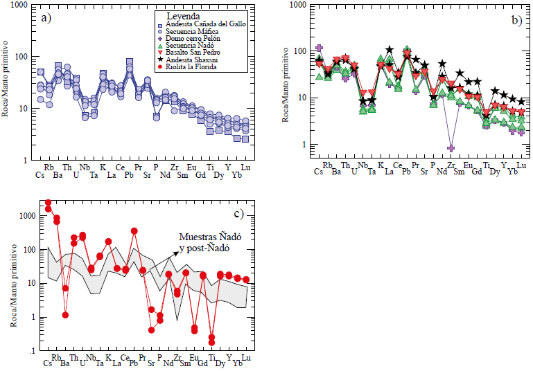 Figura 10 Diagramas multielementales normalizados a manto primitivo utilizando los valores de Sun y McDonough (1989). a) Unidades de la secuencia post-Ñadó; b) Unidades de la secuencia pre-Ñadó y Ñadó; c) Riolita La Florida de la secuencia pre-Ñadó comparada con las unidades Ñadó y post-Ñadó.