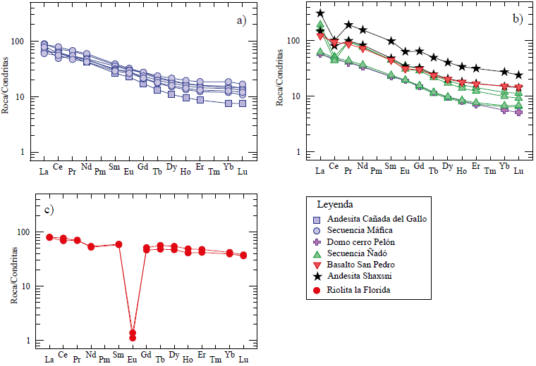Figura 11 Diagrama de tierras raras normalizados a condritas utilizando los valores de Sun y Mc Donough, 1989. a) Unidades de la secuencia post-Ñadó; b) Unidades de la secuencia pre-Ñadó y Ñadó; c) Riolita La Florida de la secuencia pre-Ñadó.