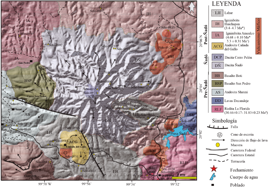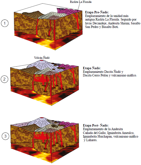 Con base en su posición estratigráfica y grado de erosión (Figura 2), las dacitas del volcán Decandeje (pre-Ñadó) probablemente se emplazaron en el episodio inicial del CVTM (Gómez-Tuena et al., 2005). Posteriormente se originaron las unidades andesita Shaxni, basalto San Pedro y basalto Boti, que se pueden correlacionar con el segundo episodio (pulso máfico) de magmatismo del CVTM que varía de Mioceno tardío a Plioceno (Gómez-Tuena et al., 2005).