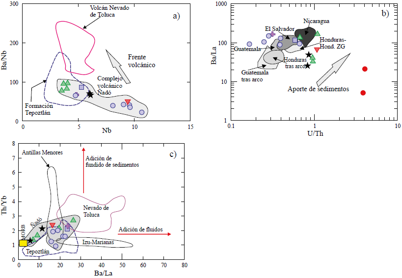 Para mejor identificar la contribución de fluidos acuosos o de fundidos de sedimentos como agentes que intervinieron en la generación de los magmas que dieron origen a las rocas del CVÑ, también se utilizaron las relaciones Ba/La vs. Th/Nb (Figura 13c) (Pearce et al., 2005; Hanyu et al., 2006). En esta gráfica se aprecia que las rocas del CVÑ muestran valores bajos en ambas relaciones, lo cual nuevamente sugiere que sus magmas tuvieron poco aporte de ambos agentes metasomáticos (fundidos de sedimentos y fluidos acuosos). En la misma gráfica se comparan a las rocas del Volcán Ñadó con ejemplos típicos de la literatura de magmas enriquecidos en sedimentos (Antillas Menores) y otros con importante influencia de fluidos del slab (Izu-Marianas). Así mismo se comparan con rocas de la Formación Tepoztlán y Nevado de Toluca, en donde se aprecia que Tepoztlán presenta valores similares al CVÑ, mientras que el Nevado de Toluca (Pleistoceno-Holoceno; García-Palomo et al., 2000; Arce et al., 2003; Torres-Orozco et al., 2012) presenta valores altos en ambas relaciones. Esto último podría explicarse por la diferencia de edades, mientras Tepoztlán y CVÑ representan tal vez las primeras manifestaciones del vulcanismo relacionado al CVTM (Mioceno temprano), en donde los primeros fundidos probablemente tuvieron poca influencia del slab, y con el paso del tiempo los fluidos y fundidos modificaron la región de generación de magmas por debajo del CVTM.