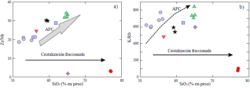 De manera general los magmas pueden experimentar procesos diversos de evolución (e.g., fusión parcial, cristalización fraccionada, asimilación cortical, asimilación-cristalización fraccionada y mezcla de magmas). Los elementos K, Rb, Zr y Nb son altamente incompatibles y cuando se utilizan las relaciones K/Rb y Zr/Nb vs. SiO2, éstos se mantienen constantes durante un proceso de cristalización fraccionada, excepto en líquidos extremadamente evolucionados (Hart y Allegre, 1980; Albarede, 1995).