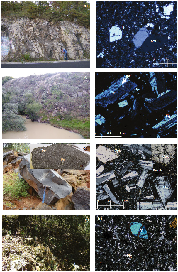 Figura 3 Unidades de la secuencia pre-Ñadó. a) Afloramiento representativo de la unidad Riolita La Florida, el cual exhibe un intenso fracturamiento. b) Microfotografía de la Riolita La Florida, en la que se muestran la textura porfídica con fenocristales de cuarzo (Qz) y sanidino (San) con macla carlsbad, inmersos en matriz de grano más fino. La muestra corresponde a la clave ÑDO-0908. c) Afloramiento de la andesita Decandeje, localizado en la compuerta de la presa Ñadó; se observan bloques mayores a 2 m y un espesor de esta unidad superior a los 9 m. d) Textura porfídica con fenocristales subédricos y euédricos de plagioclasa (Plg) y ortopiroxeno (Opx) embebidos en una matriz formada por microlitos de plagioclasa y vidrio en la andesita Decandeje, la cual corresponde a la muestra ÑDO-0934. e) Unidad andesita Shaxni en la que se pueden apreciar bloques de tonalidad gris oscuro con fenocristales grandes de piroxeno (2 mm, recuadro superior derecho). f) Microfotografía de la andesita Shaxni (ÑDO-0929) en la que se observa la textura porfídica con fenocristales euédricos y subédricos de plagioclasa (Plg) y ortopiroxeno (Opx), embebidos en microlitos de plagioclasa y vidrio. g) Afloramiento de la unidad basalto San Pedro, localizado en la población del mismo nombre. Se observan bloques mayores a 1 m de color gris claro y parcialmente cubiertos por vegetación. h) Microfotografía del basalto San Pedro (ÑDO-930), el cual exhibe una textura porfídica, con fenocristales de olivino (Ol) y plagioclasa (Plg), inmersos en una matriz formada por microlitos de plagioclasa.