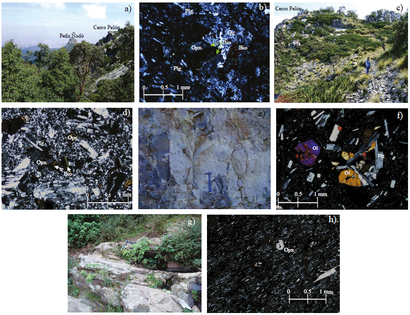 Figura 4 Unidades de la secuencia Ñadó y post-Nadó. a) Vista panorámica hacia el norte desde la cima del volcán Ñadó, en donde se aprecian la Peña Ñadó y el domo Cerro Pelón. b) Microfotografía de la unidad dacita Ñadó (ÑDO-906), en la que se observan intercrecimientos de cuarzo (Qz) y plagioclasa (Plg) y biotita (Bio), fenocristales de plagioclasa (Plg) y ortopiroxeno (Opx) en una matriz de microlitos de plagioclasa y vidrio. c) Fotografía del Cerro Pelón; lava de color gris claro y de estructura masiva. d) Fenocristales euédricos de plagioclasa (Plg) y ortopiroxeno (Opx) inmersos en matriz microgranular, en la dacita domo Cerro Pelón (ÑDO-0914). Nótese la presencia de biotita en los bordes del ortopiroxeno. e) Fotografía de un afloramiento correspondiente al vulcanismo máfico, en donde se observa un derrame de lava masiva, emitido por un cono de escoria. f) Microfotografía que muestra la textura porfídica, con fenocristales de olivino (Ol) y plagioclasa (Plg) embebidos en una mesostasis de microlitos de plagioclasa y vidrio de productos del vulcanismo máfico (ÑDO-0926). g) Fotografía de un afloramiento de la unidad Cañada del Gallo, el cual presenta lavas con una estructura lajeada, de color gris claro. h) Microfotografía de la andesita Cañada del Gallo. Se observan fenocristales subédricos de ortopiroxeno (Opx) inmersos en una mesostasis constituida por microlitos de plagioclasa orientados (ÑDO-0911).