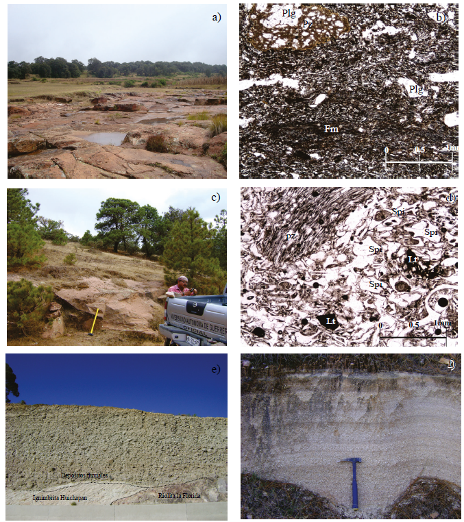 La Ignimbrita Huichapan, asociada a la formación de la caldera homónima, aflora principalmente en la parte NE del área y se distribuye al E y SE (Aguirre-Díaz, 1996) (Figuras 2 y 5c). Se observa formando lomeríos suaves, cubre parcialmente a las lavas del Volcán Ñadó y en ocasiones subyace y en otras sobreyace a los productos del vulcanismo máfico (Figura 2). En el poblado La Florida es posible observar la Ignimbrita Huichapan sobre la Riolita La Florida. Sobreyaciendo a éstas se encuentran lahares y depósitos fluviales (Figura 5e). La Ignimbrita Huichapan llega a formar depósitos de espesores de hasta 15 m, los cuales desarrollan estructuras columnares moderadamente soldadas. En muestra de mano se observa una textura piroclástica, presenta un color de intemperismo café rojizo, mientras que en roca sana presenta un color rosa. En la muestra se pueden observar fragmentos líticos y pómez de color oscuro, café, gris y blanco, todos estos embebidos en una matriz de ceniza. Los fragmentos de pómez están principalmente alargados formando fiammes y sus dimensiones van de 2 mm a 3 cm. En lámina delgada presenta una textura piroclástica o fragmentada. En su mayoría es vidrio (Figura 5d), se observan líticos, cristales de plagioclasa y piroxeno. Los líticos alcanzan un tamaño máximo de 2.5 mm de longitud; en menor proporción se observan fragmentos de pómez alargados (fiammes) de color café de hasta 3.5 mm de largo.