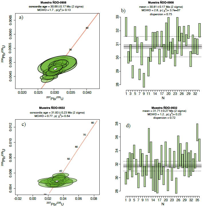 Dos muestras correspondientes a la Riolita La Florida (ÑDO-908 y ÑDO-932), fueron fechadas por el método de U-Pb (Tabla A2). La mayoría de circones analizados resultaron concordantes (34 de 40 y 36 de 41, respectivamente) en los diagramas de concordia (Figuras 6a y 6c) y fueron utilizados para calcular las edades medias ponderadas (Figuras 6b y 6d). Los promedios de las edades obtenidas de 30.81±0.17 y 31.71±0.27 Ma se interpretan como edades de emplazamiento de la Riolita La Florida. Con base en estos resultados la Riolita La Florida representa las rocas volcánicas más antiguas del área de estudio. Para el volcán Ñadó se procesaron dos muestras de lava de composición dacítica, sin embargo, no fue posible encontrar cristales de circón, por lo tanto, no se tienen edades radiométricas para esta estructura. Por posición estratigráfica se puede considerar que el volcán Ñadó es más antiguo que 5 Ma, ya que sus productos están cubiertos por las ignimbritas de las calderas de Amealco y Huichapan.