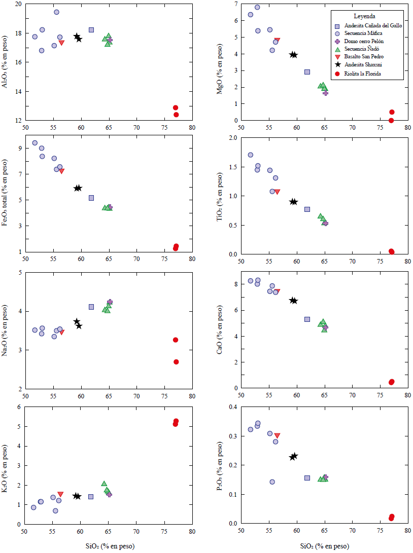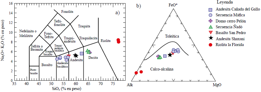Para la clasificación química de las muestras del CVÑ, se utilizó el diagrama de álcalis total vs. sílice de Le Bas et al. (1986). Las muestras de la Riolita La Florida varían de 76.1 a 76.4 % en sílice. Las dacitas del Volcán Ñadó y del domo Cerro Pelón muestran un contenido en sílice de 63.9-64.5 % y 65.1 %, respectivamente. La andesita Shaxni muestra un contenido en sílice de 59.0-59.3 % y la andesita Cañada de Gallo de 61.5 %. El basalto San Pedro contiene 56.2 % de SiO2, mientras que las muestras del vulcanismo máfico varían de 51.6 a 52.26 % de SiO2 (Tabla 1; Figura 7a).