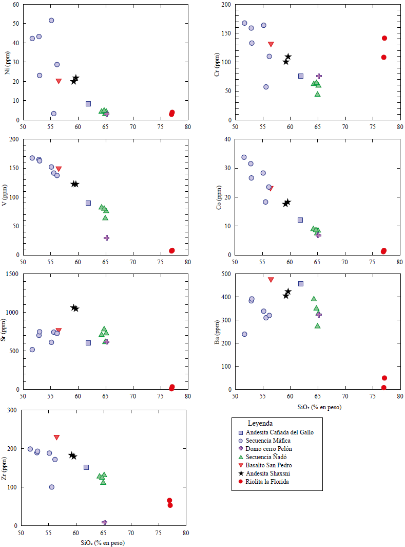 En los diagramas bivariados de elementos traza vs. SiO2 (Figura 9) se observa una tendencia negativa en los elementos Cr, V, Co y ligeramente negativa para el Ni y Zr. En los elementos Sr y Ba se aprecia una ligera tendencia positiva. Resalta el bajo contenido de Ba en la Riolita La Florida, comparado con las demás muestras (Figura 9) a pesar de que son rocas más evolucionadas.