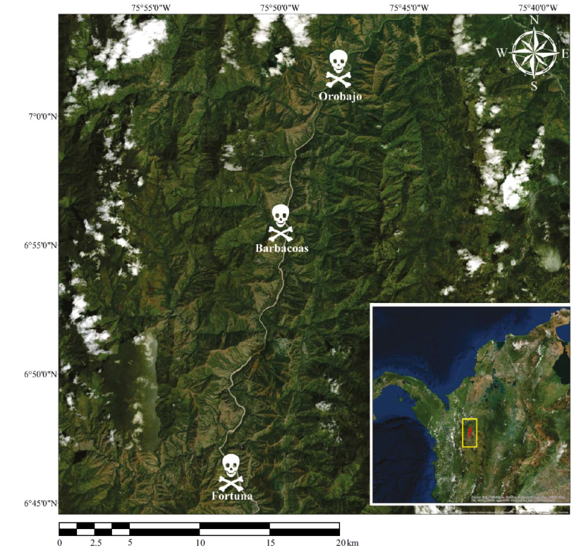 En el Departamento de Antioquia, Colombia, se llevó a cabo el proyecto de exhumación y traslado administrativo de los cementerios comunitarios de las localidades de Orobajo, Barbacoas y La Fortuna debido a la construcción de la Hidroeléctrica Ituango, de Empresas Públicas de Medellín (EPM), en el cañón del río Cauca (Figura 1). La finalidad del traslado de dichos cementerios consistió en la restitución integral y con un sentido social de la herencia fúnebre perteneciente a las comunidades reubicadas. Estos cementerios rurales, no tenían formalidad administrativa y carecían de actas de inhumación-exhumación. Al momento de la prospección y excavación, tampoco poseían estructuras diferenciadoras en el terreno como monumentos ni lápidas, lo que precisó de la integración de técnicas antropológicas y pedológicas en la búsqueda de los restos para su recuperación.