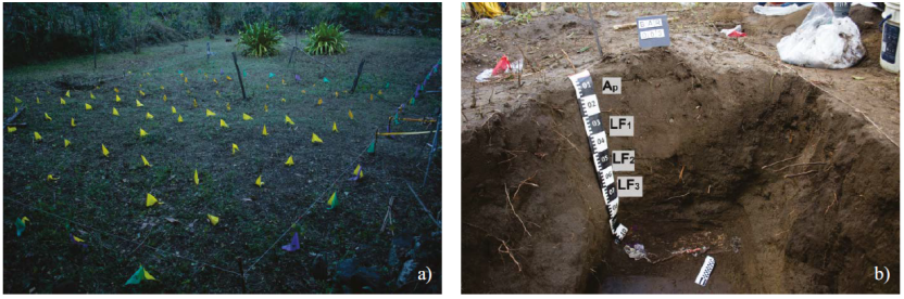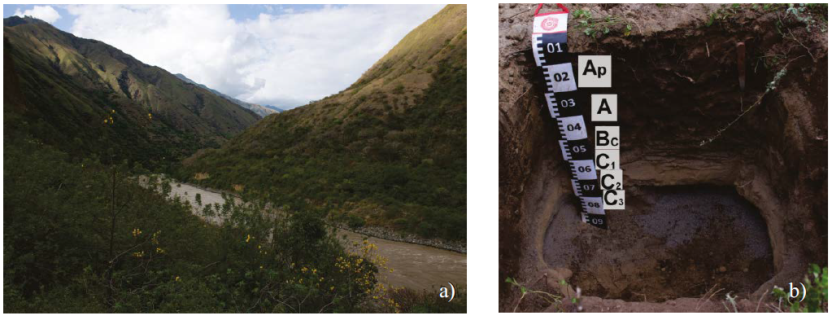 Figura 2 Evidencia macromorfológica en los perfiles pedológicos naturales. a) Una vista panorámica del relieve asociado a los suelos naturales. b) Perfil de suelo natural.