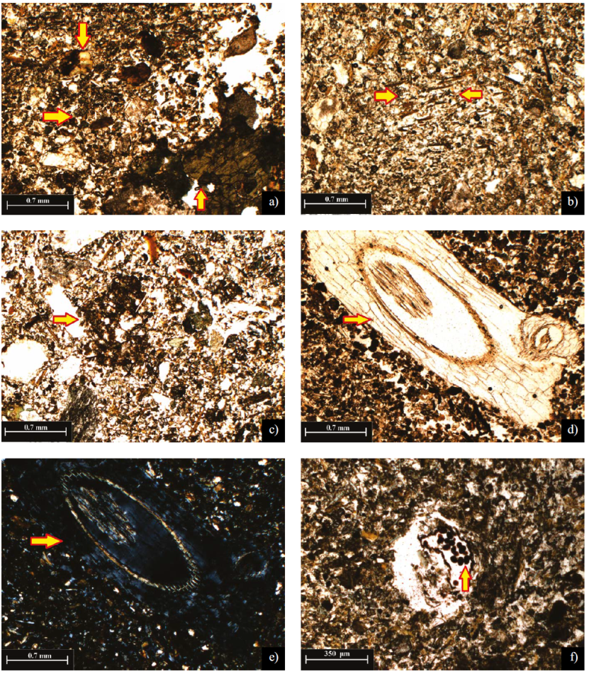 Figura 5 Micromorfología de suelos de cementerio: Composición y estructura microscópica de los suelos de las tumbas. a) Composición heterogénea del horizonte Ap (0-8 cm) perfil tipíco de tumba Orobajo. b) Microáreas con orientación de minerales micáceos de la fracción gruesa en material de relleno LF (75 cm) Orobajo. c) Mezcla de agregados pedogenéticos entre matriz finogranular en material de relleno de tumbas LF (25-37 cm) Orobajo. d) Raíces frescas finas en perfil de tumba réplica de Orobajo a 182 cm de profundidad vista sin Nicoles Cruzados. e) Raíces frescas finas en perfil de tumba réplica de Orobajo a 182 cm de profundidad vista con Nicoles Cruzados. Se ven colores de interferencia de los tejidos radicales. f) Conjunto de coprolitos de mesofauna asociados con actividad biogénica en material de relleno de tumbas LF (52-100 cm) Barbacoas.