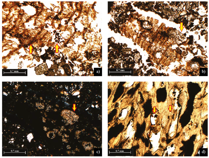 La distribución de las inclusiones de los materiales antropogénicos era muy heterogénea en los suelos asociados con las tumbas: en algunas láminas esas inclusiones abundaban mientras en otras ausentaban. En particular, se observaron grandes fragmentos de madera con el grado de descomposición baja a mediana. Asociada a esos fragmentos estaba calcita microcristalina (micrita) que formó clústeres en los poros del tejido de madera (Figuras 6a, 6b y 6c). Otro componente antrópico son pocos fragmentos de hueso, relativamente grandes y con su estructura porosa típica (Figura 6d). En la Tabla 1 se ilustra la abundancia relativa de estas características entre los suelos de cementerio y los perfiles naturales.