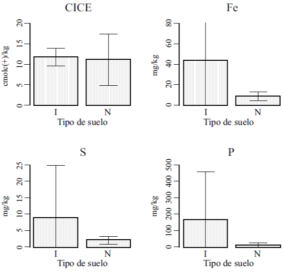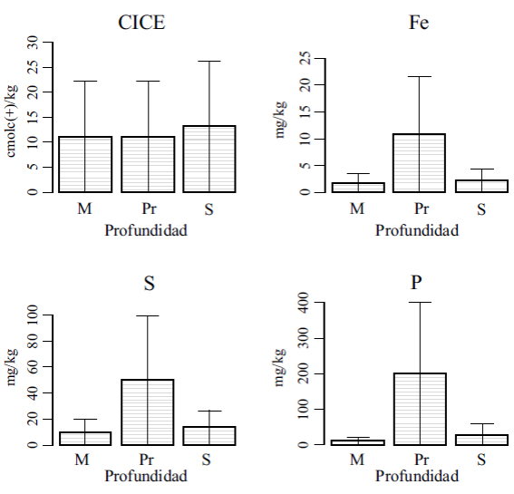 Los suelos de los cementerios respecto a los naturales presentan características químicas diferentes, aunque estas diferencias no tienen significancia estadística y su variabilidad es alta (Figuras 7 y 8). Los valores de Capacidad de Intercambio Catiónico Efectiva (CICE), S, Fe móvil y P son más elevados en los suelos provenientes de los cementerios, aunque las diferencias en CICE son muy pequeñas (Figura 8). Con respecto a la profundidad, los contenidos de S, Fe móvil y P muestran valores más altos en los horizontes más profundos de los suelos de los cementerios; la CICE tiene un valor mayor en la muestra superficial.