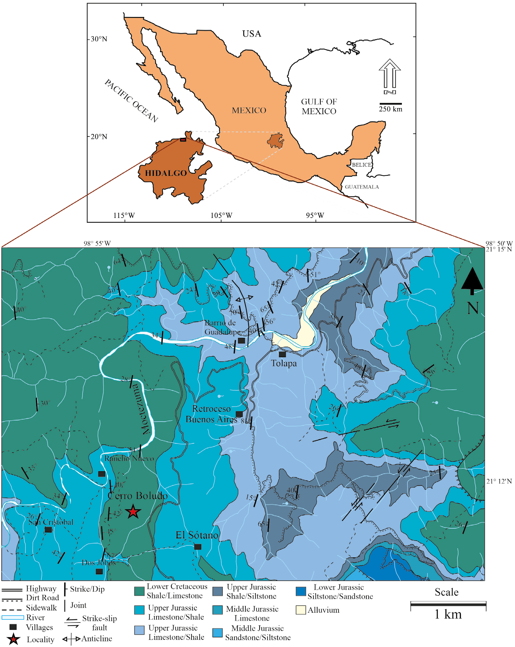 Figure 1 Geological map showing the section studied at the Cerro Boludo site, Hidalgo (Geological-Mining Chart Chapulhuacán F14-D41, scale 1:50000 of the SGM, 2004).