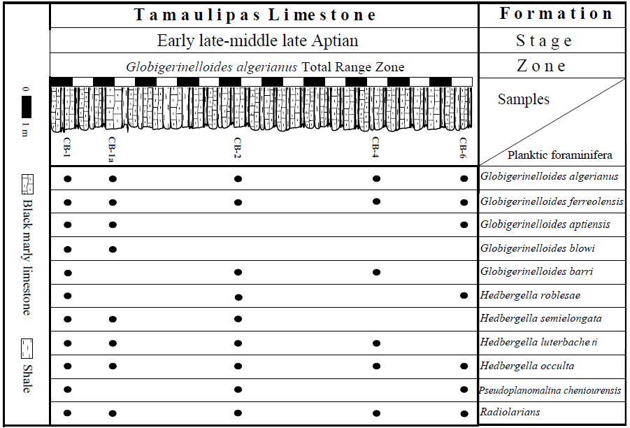 According to Longoria (1975, p. 45) the biostratigraphic position of the "Otates limestone member" correspond to Globigerinelloide algerianus Zone of late Aptian age.