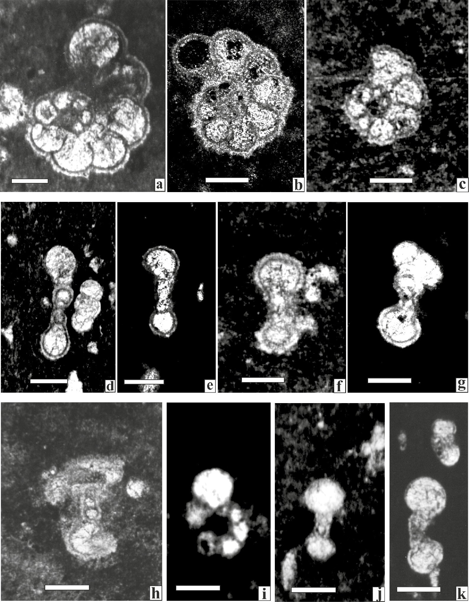 Figure 3 Planktic Foraminifera from the Globigerinelloides algerianus Total Range Zone Scale bar 50 μm. a) Globigerinelloides algerianus Cushman and ten Dam equatorial section (Sample CB-1). b) axial section (Sample CB-4). c) Globigerinelloides ferreolensis equatorial section (Sample CB-1). d) Globigerinelloides algerianus Cushman and ten Dam axial section (Sample CB-1). e) Globigerinelloides algerianus Cushman and ten Dam axial section (Sample CB-4). f) Globigerinelloides ferreolensis (Moullade ) equatorial section (Sample CB-1). g) Globigerinelloides barri (Bolli, Loeblich and Tappan, 1957) Axial section (Sample CB-1a). h) Globigerinelloides barri (Bolli, Loeblich and Tappan, 1957) Axial section (Sample CB-1). i) Globigerinelloides blowi (Bolli ) Axial section (Sample CB-1). j) Globigerinelloides aptiensis Longoria equatorial section (Sample CB-1). k) Hedbergella luterbacheri Longoria equatorial section (Sample CB-2).