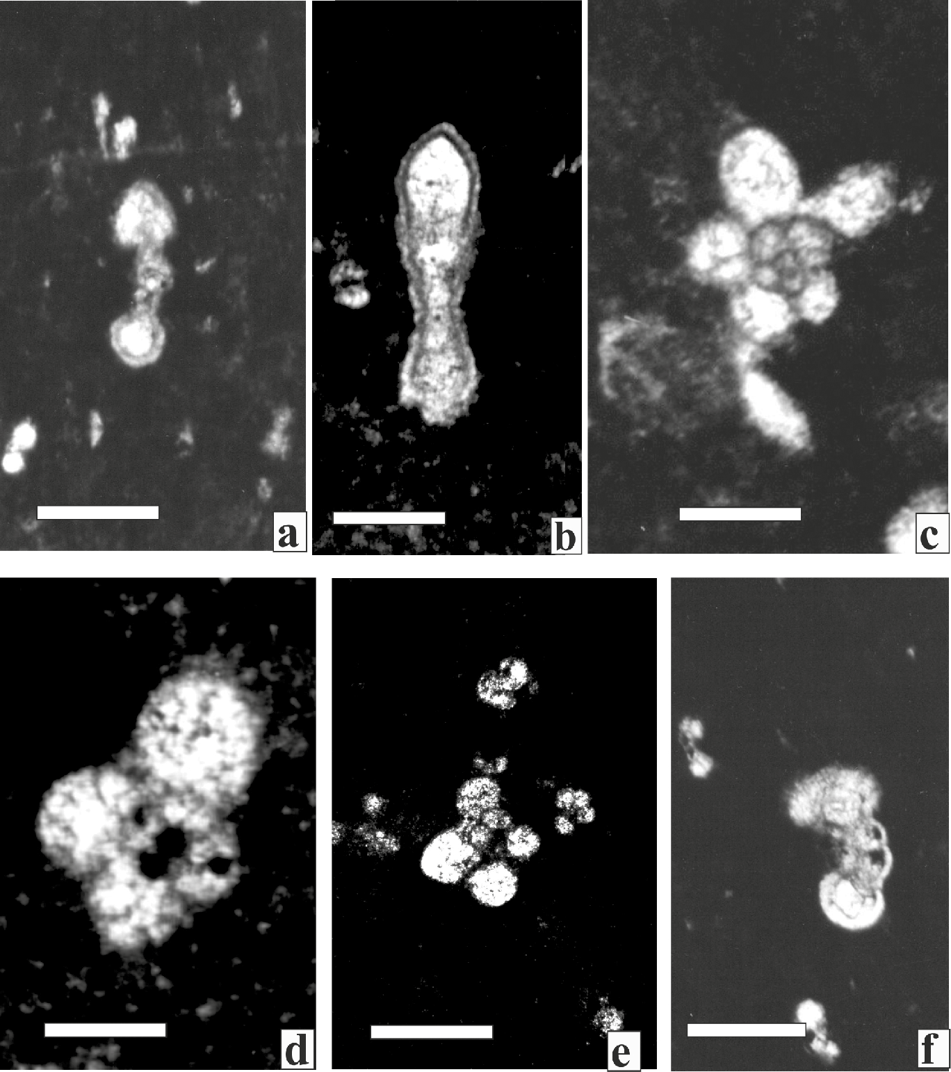 Figure 4 Planktic Foraminifera from the Globigerinelloides algerianus Total Range Zone. Scale bar 50 μm. a, b) Pseudoplanomalina cheniourensis (Sigal ) axial section (Sample CB-2); b) (Sample CB-6). c) Hedbergella roblesae (Obregón de la Parra) equatorial section (Sample CB-1). d) Hedbergella similis Longoria equatorial section (Sample CB-1). e) Hedbergella semielongata Longoria (Sample CB-1). f) Hedbergella occulta Longoria equatorial section (Sample CB-1).