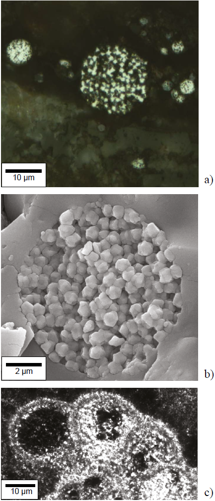 Figure 6 Photomicrographs of pyrite framboids under: a) reflected light, b) SEM, c) the foraminifer chambers filled of pyrite.