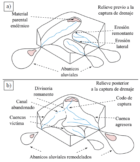 Figura 1 Esquema evolutivo de las cuencas antes de la captura de drenaje (a) y después de la captura de drenaje, cuando las cuencas agresoras empiezan a incorporar materiales de un área vecina (b). Las capturas de drenaje generan rasgos como canales abandonados, divisorias remanentes y codos de captura, los cuales son geo-marcadores útiles en la detección de las capturas de drenaje.