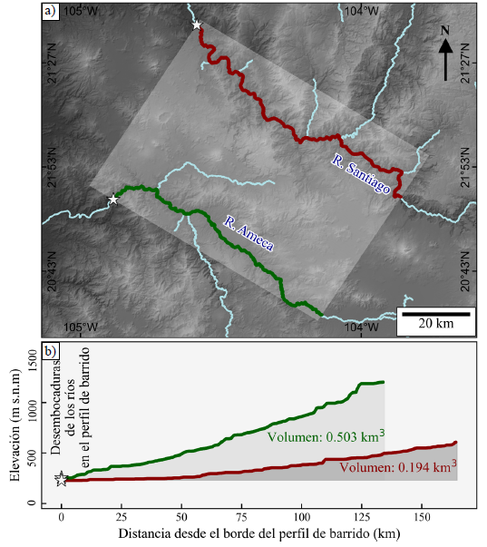 Finalmente, los resultados de este trabajo contribuyen a entender escenarios donde la actividad volcánica tiene una gran capacidad de generar nuevos relieves y promover la erosión de divisorias que reorganizan cuencas prexistentes, como ha sido expuesto en el caso concreto de las cuencas Ameca y Santiago previas al emplazamiento de la FVTM.
