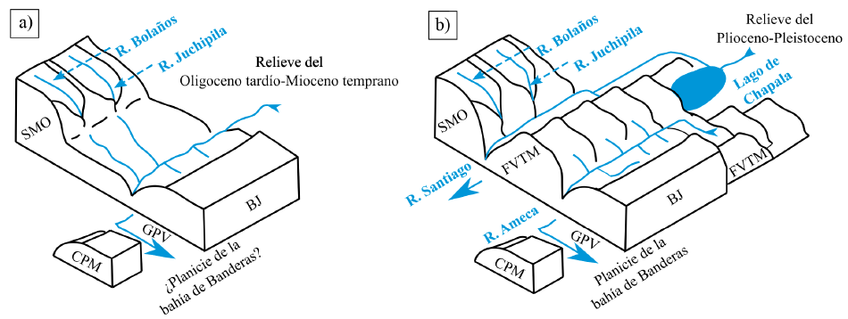 Proponemos que durante el Oligoceno-Mioceno, el BJ habría sido un relieve mayoritariamente granítico-metamórfico cubierto parcial mente por rocas volcánicas del Paleógeno temprano (Valencia-Moreno et al., 2021; Schaaf et al., 2020), sus afluentes drenarían hacía el GPV y la bahía de Banderas, junto con la carga proveniente de la SMO (Figura 11). Posteriormente, el volcanismo de la FVTM durante el Mioceno tardío y el Plioceno (Ferrari et al., 2012) cubrió parcialmente el sector norte del BJ, y terminaría por aislar una porción del relieve que ahora corresponde a la cuenca del Río Ameca (Figura 11b).