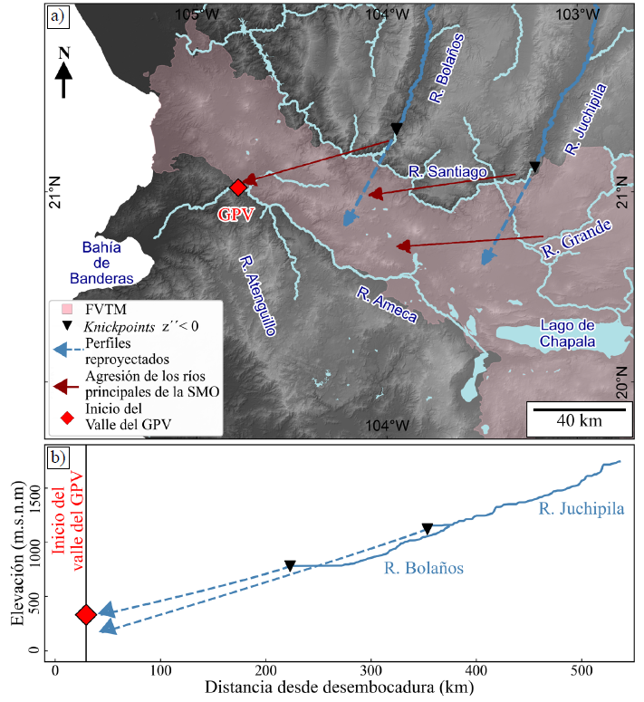 Figura 12 a) Una proyección de las últimas inflexiones de los ríos Bolaños y Juchipila muestra que apuntan hacia el GPV, lo que indica que la tendencia erosiva es oblicua a la actual orientación E-W de la FVTM. b) Los perfiles reconstruidos de los ríos Bolaños y Juchipila proyectan parcialmente al GPV, lo cual sugiere una conexión con el río Ameca.