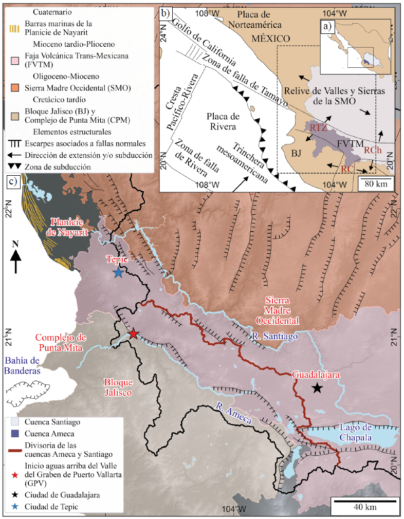 Esto último apoya el argumento de una obstrucción reciente del dre naje entre el Plioceno-Pleistoceno. La formación de las estructuras tectónicas y el emplazamiento del volcanismo de la FVTM generaron barreras topográficas que produjeron el aislamiento de la cuenca del río Ameca, la cual pudo ser parte de un sistema más grande que erosionaba y transportaba materiales de la SMO y, muy probablemente, de las partes centrales de México.