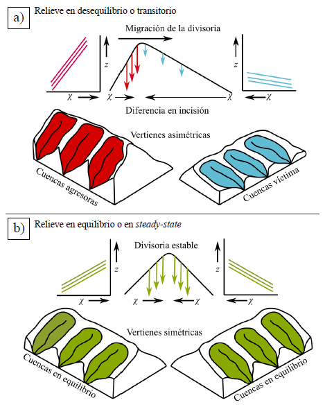 Figura 3 La asimetría en el gradiente de las vertientes está reflejada en los valores χ, el desequilibrio fomenta la erosión remontante y un mayor gradiente (a), lo cual resulta en la migración de la divisoria a fin de alcanzar el equilibrio (simetría) entre las vertientes (b).