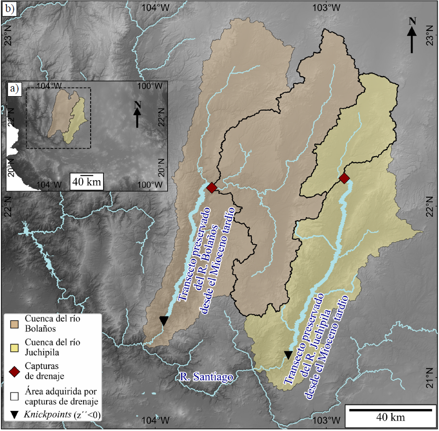 Figura 4 a) Contexto de los ríos Bolaños y Juchipila. b) Mapa de las principales capturas de drenaje en las cuencas de los ríos (R.) Bolaños y Juchipila. Los transectos más gruesos resultan de la remoción del área de drenaje de las capturas, aquella que ya no corresponde al área original drenada por los grábenes. Los knickpoints fueron delimitados por medio de la segunda derivada de la elevación (z'') desde aguas arriba y se extrajeron aquellos valores por encima del cuantil 0.99 y debajo del cuantil 0.01, los knickpoints z''<0 corresponden a incrementos de gradiente aguas abajo, i.e. el límite del levantamiento más reciente.