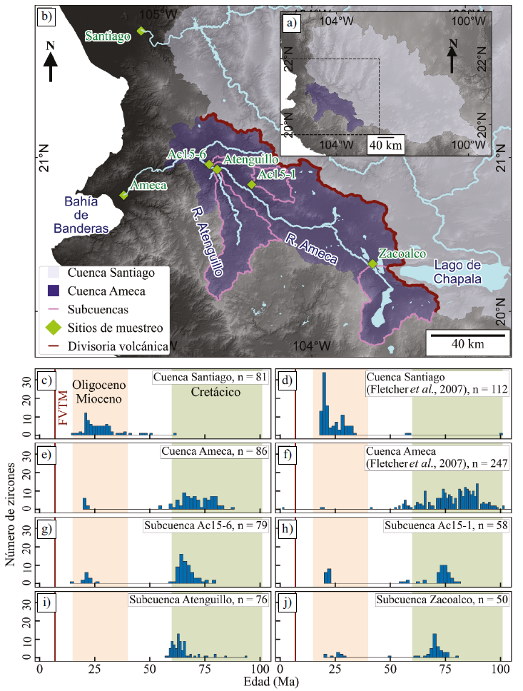 Las edades de los zircones detríticos en el curso bajo de las cuencas del occidente de México (Figura 5a y 5b) muestran que para la cuenca Santiago, la mayoría de las edades está en un intervalo de ~30 a 20 Ma que corresponde al Oligoceno tardío al Mioceno temprano (Figura 5c). Las edades determinadas en este estudio son consistentes con las obtenidas por Fletcher et al. (2007) en las porciones sur de la SMO (Figura 5d). Para el caso de la cuenca Ameca, la mayoría de las edades está en un intervalo de ~80 a 60 Ma que corresponde al Cretácico tardío (Figura 5e) y es concordante con la cronología de Fletcher et al. (2007) para las porciones norte del BJ (Figura 5f). No obstante, los datos de la cuenca Ameca registran un segundo grupo de edades ubicadas entre el Oligoceno tardío y el Mioceno temprano (Figura 5e) y que son más antiguas a la edad establecida para el volcanismo de la FVTM en el Mioceno tardío (Gómez-Tuena et al., 2007). Los ríos que inciden en la parte meridional de la FVTM y alrededor del lago Zacoalco (Figura 5b) también presentan zircones de edades entre el Oligoceno tardío y el Mioceno temprano (Figura 5g, 5h y 5j).
