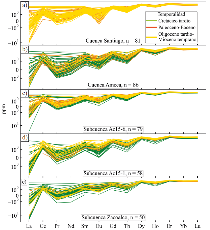 Las concentraciones de las ETR (ppm) en los zircones detríticos fueron normalizadas con las concentraciones de las ETR registradas en las condritas (Taylor y McLennan, 1981), las concentraciones normalizadas se graficaron por cuenca y subcuenca para visualizar patrones que indiquen semejanzas en composición química.